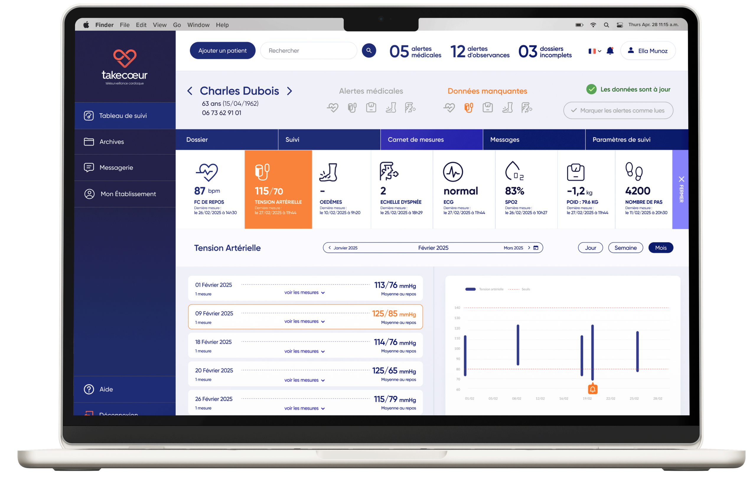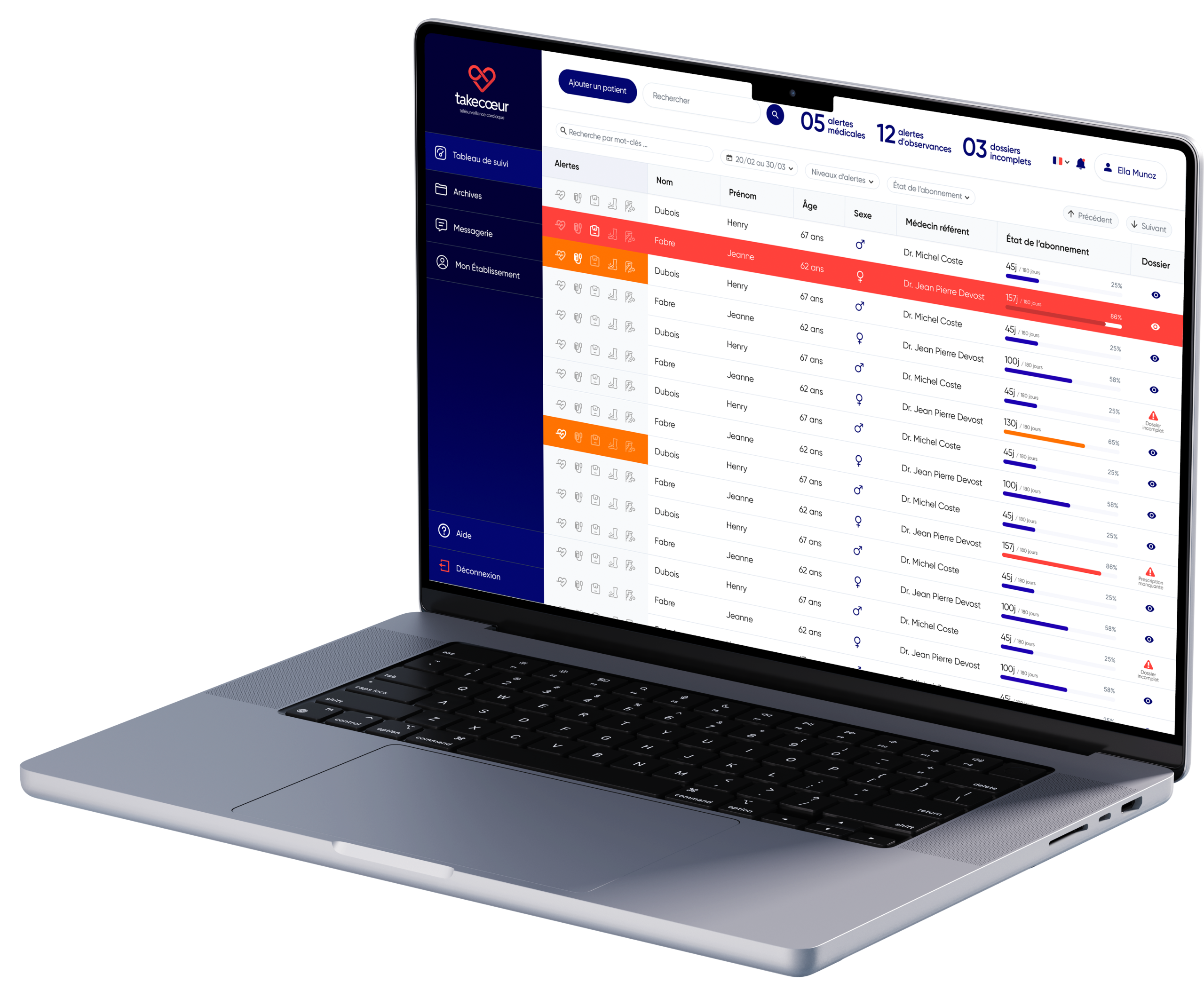 Takecoeur ICC centralise les mesures essentielles du patient pour permettre une télésurveillance structurée :
